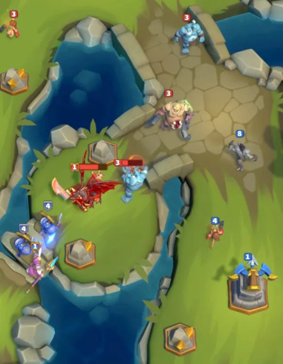 Key Features: PvP maps typically feature multiple paths (lanes), strategic towers (like Guard Towers), and gold mines that are critical to securing victory through controlling map.